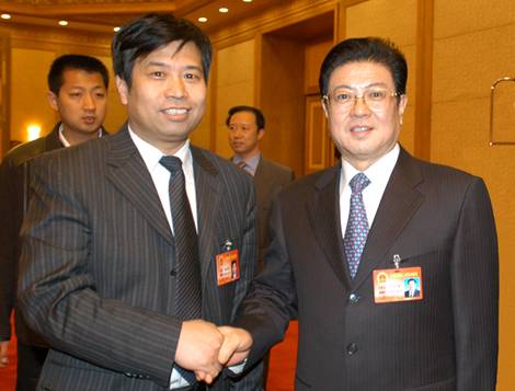 十屆全國人大四次會議期間,全國人大副委員長王兆國與藥都集團董事長李曉恩親切交談并合影