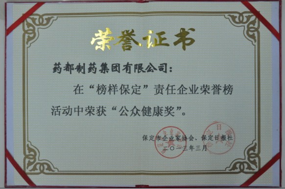 2013年3月29日,保定市工業(yè)和信息化局發(fā)布了評審結(jié)果,我公司在“榜樣保定”責(zé)任企業(yè)榮譽(yù)榜活動(dòng)中榮獲“公眾健康獎(jiǎng)”。